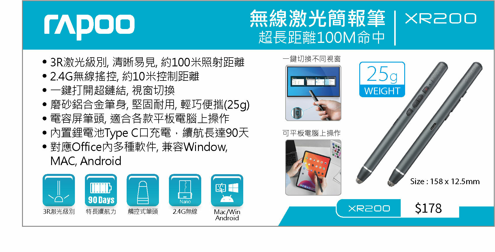 Rapoo - XR200無線激光簡報筆 演示器 翻頁筆 (香港行貨 1年保養)