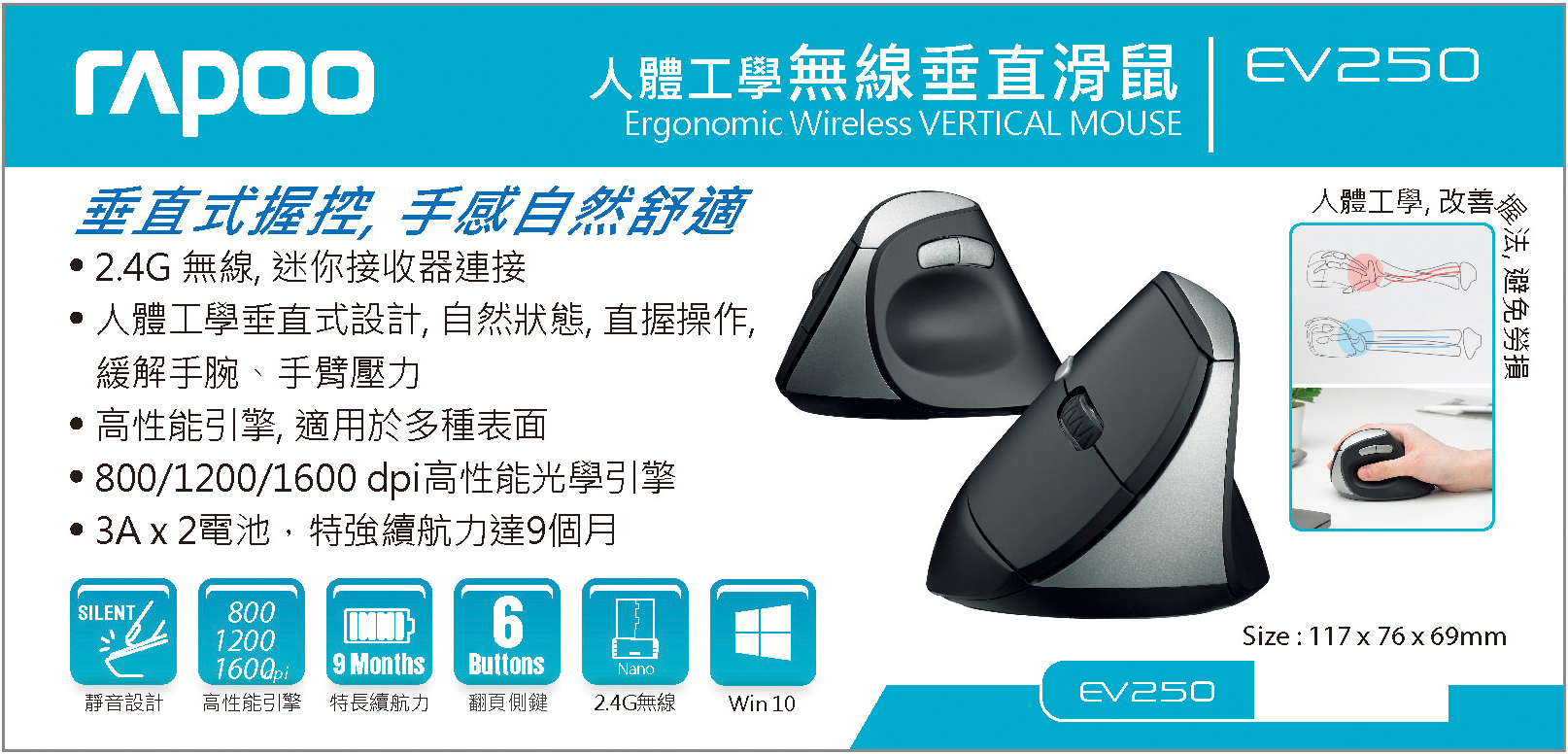 RAPOO EV250 人體工學靜音無線2.4G直立式垂直滑鼠 (香港行貨 1年保養)