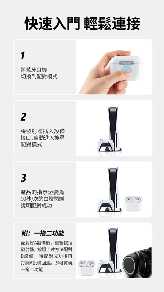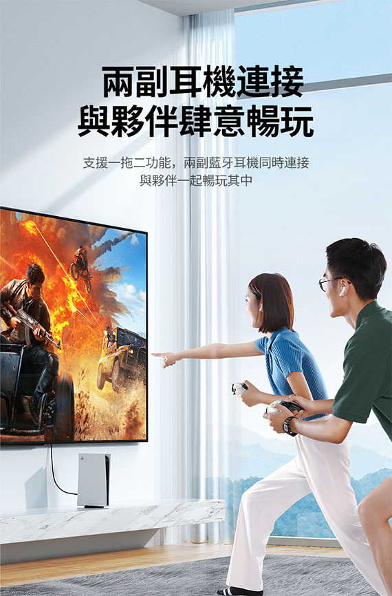 - 支援一拖二功能 兩副耳機同時連接