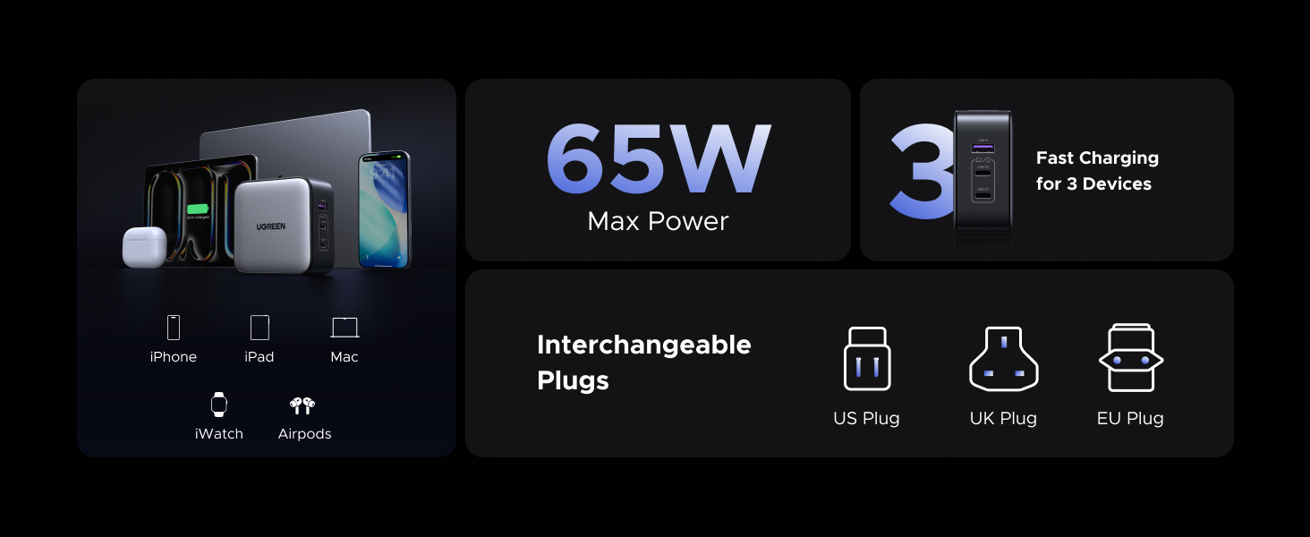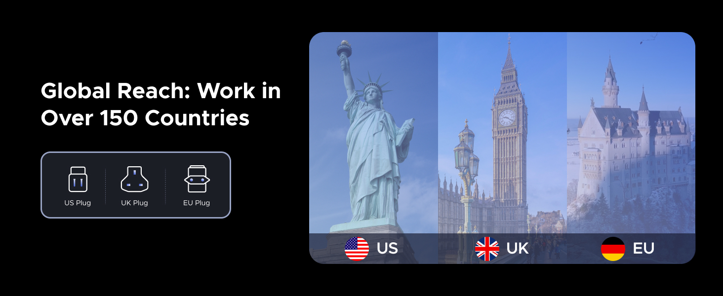 - 歐盟、美國、英國可切換插頭,適合全球旅行,並支援 100V-240V 的全球通用電壓