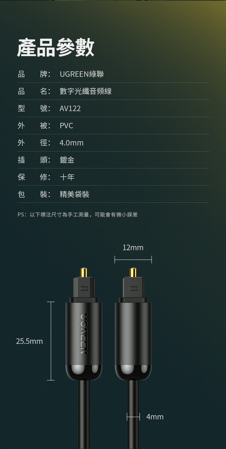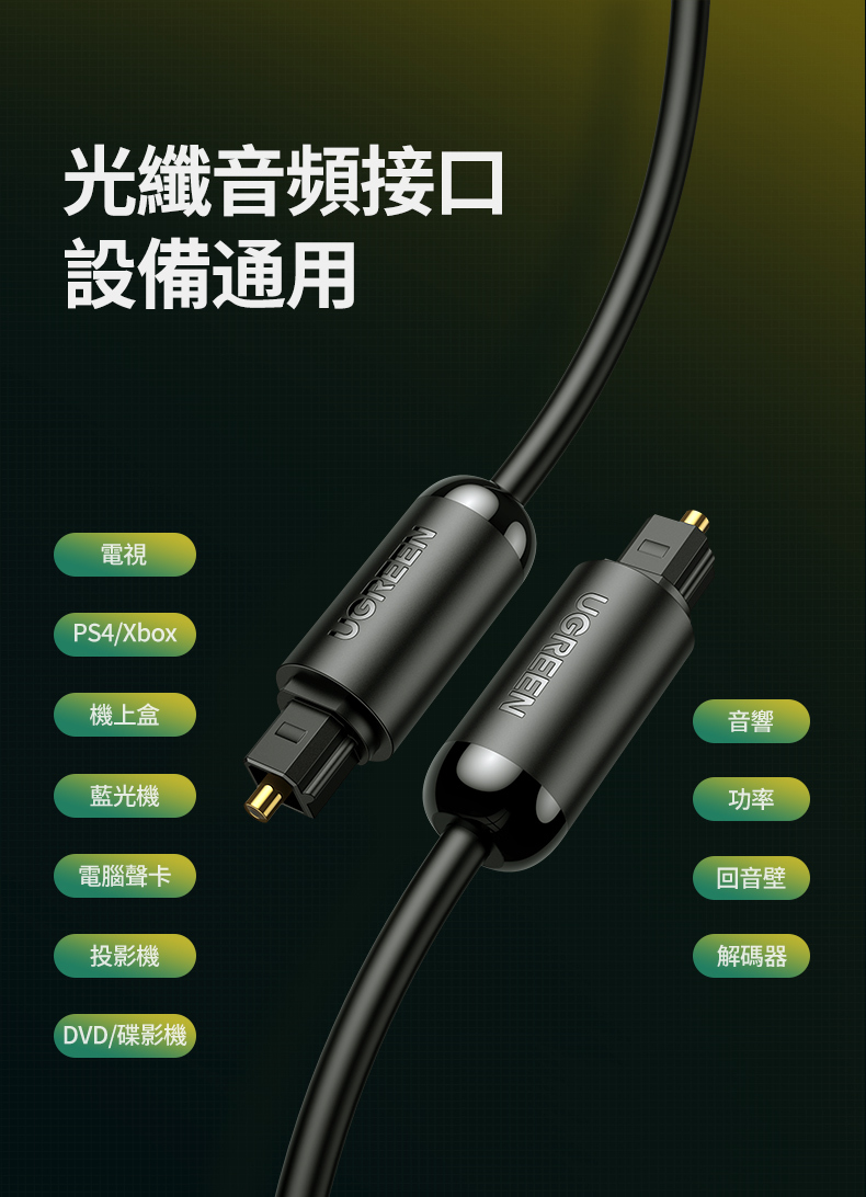 UGREEN - 光纖數據線 Toslink Optical Audio Cable ㇐體注塑接頭